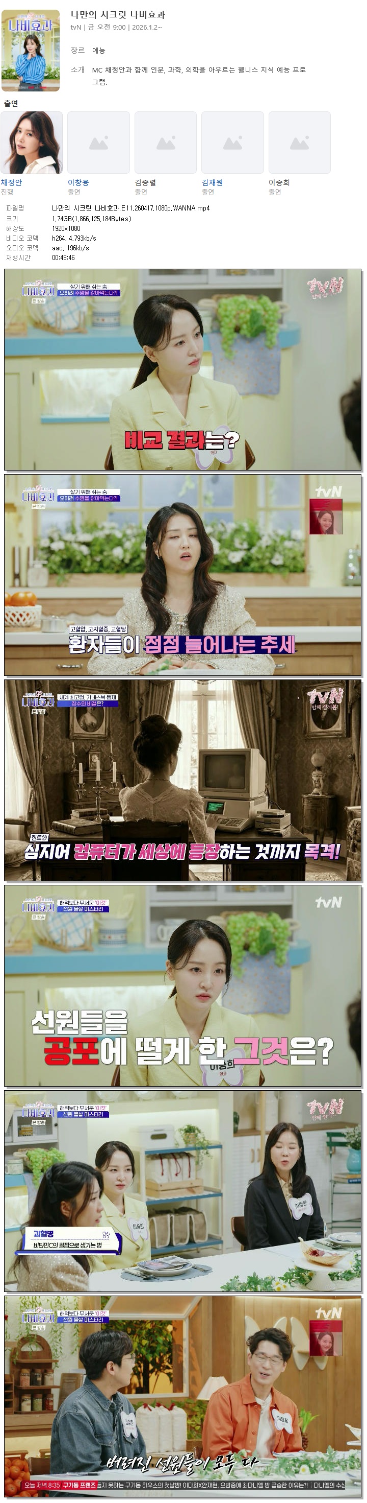 | [TVN] 나만의 시크릿 나비효과.E11.260417.1080p.WANNA[채정안, 이창용].mp4 | 1.7 G | 00:49:46 | 1920x1080 |