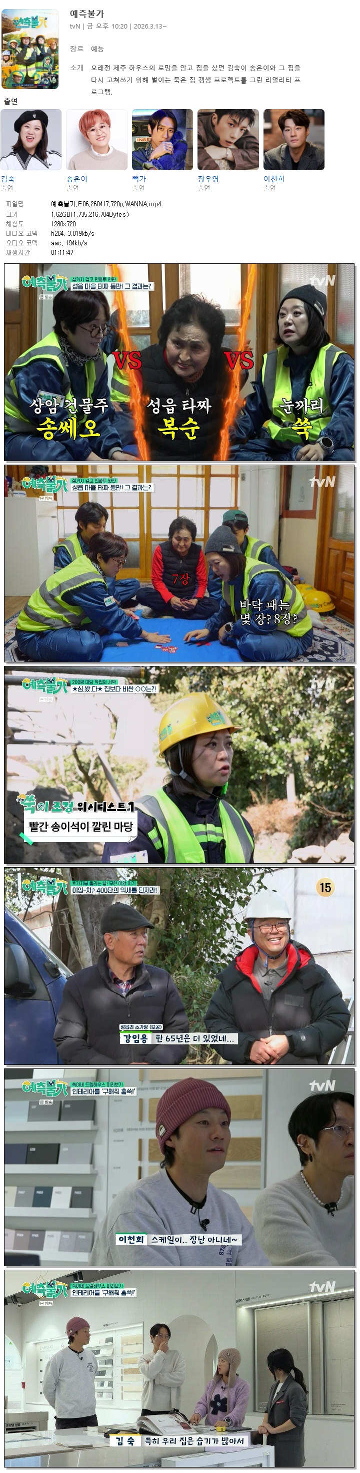 | [TVN] 예측불가.E06.260417.720p.WANNA[김숙, 송은이].mp4 | 1.6 G | 01:11:47 | 1280x720 |