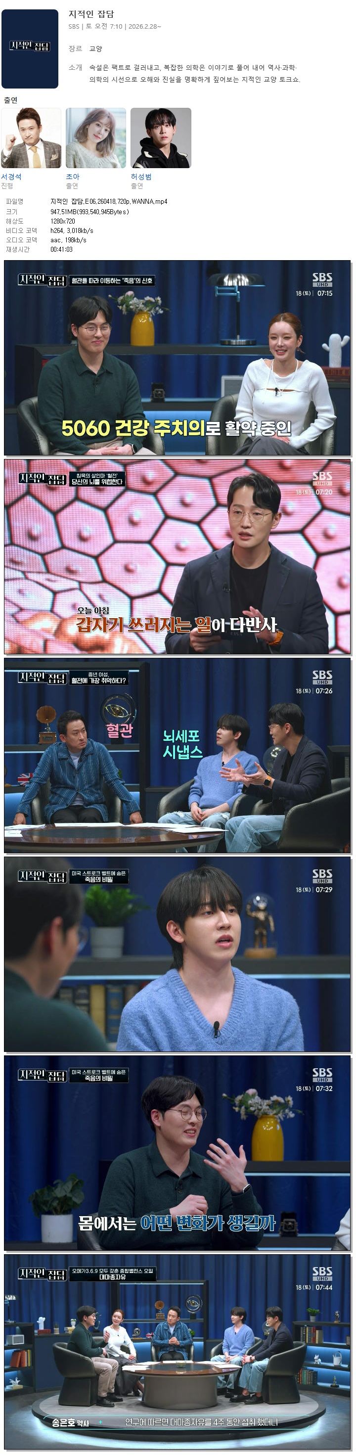 | [SBS] 지적인 잡담.E06.260418.720p.WANNA[서경석, 초아].mp4 | 947.5 M | 00:41:03 | 1280x720 |