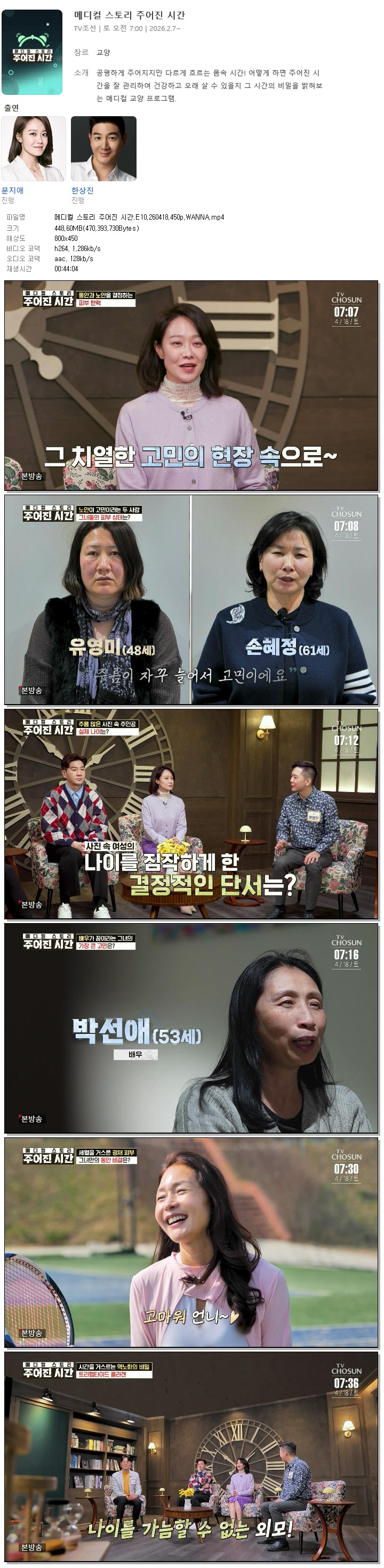 | [TV조선] 메디컬 스토리 주어진 시간.E10.260418.450p.WANNA[문지애, 한상진].mp4 | 448.6 M | 00:44:04 | 800x450 |