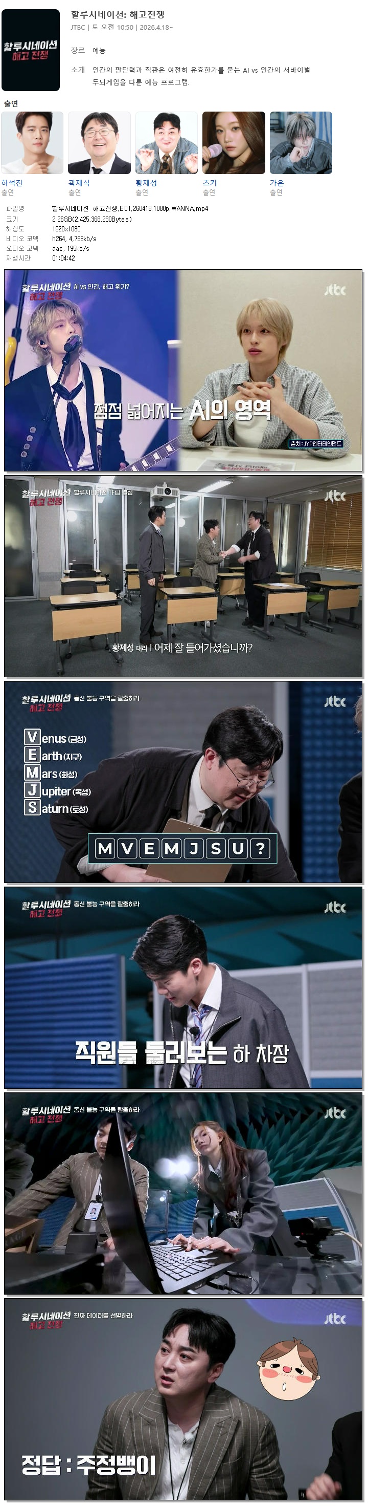 | [JTBC] 할루시네이션 해고전쟁.E01.260418.1080p.WANNA[하석진, 황제성].mp4 | 2.3 G | 01:04:42 | 1920x1080 |