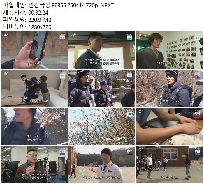 | 인간극장.E6365.260414.720p-NEXT.mp4 | 820.9 M | 00:32:24 | 1280x720 |