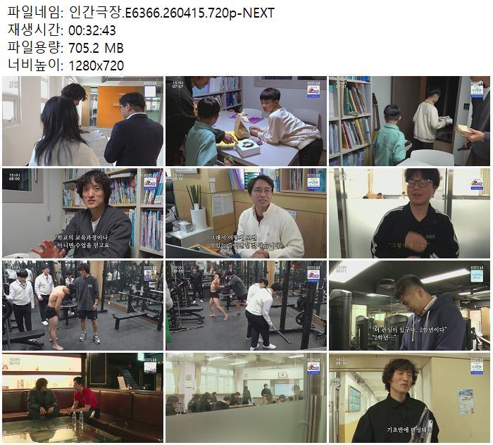 | 인간극장.E6366.260415.720p-NEXT.mp4 | 705.2 M | 00:32:43 | 1280x720 |