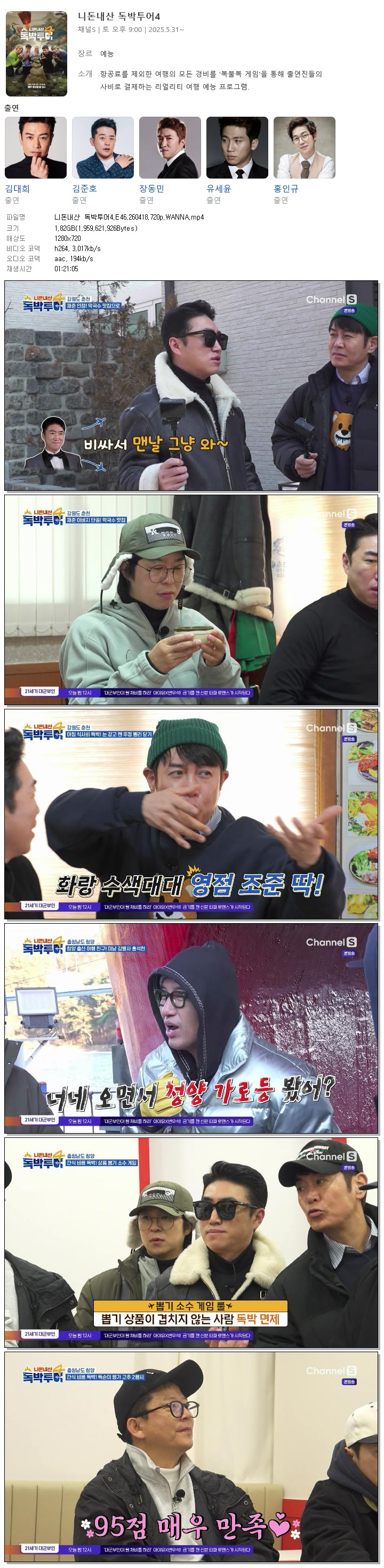 | [채널S] 니돈내산 독박투어4.E46.260418.720p.WANNA[홍석천, 김준호].mp4 | 1.8 G | 01:21:05 | 1280x720 |