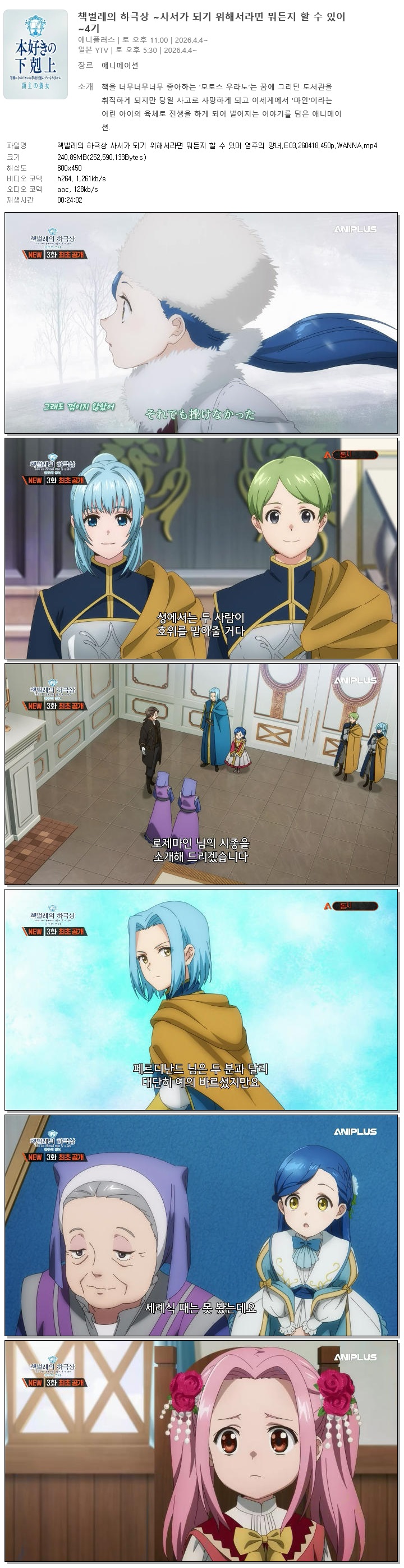 | 책벌레의 하극상 사서가 되기 위해서라면 뭐든지 할 수 있어 영주의 양녀.E03.260418.450p.WANNA.mp4 | 240.9 M | 00:24:02 | 800x450 |