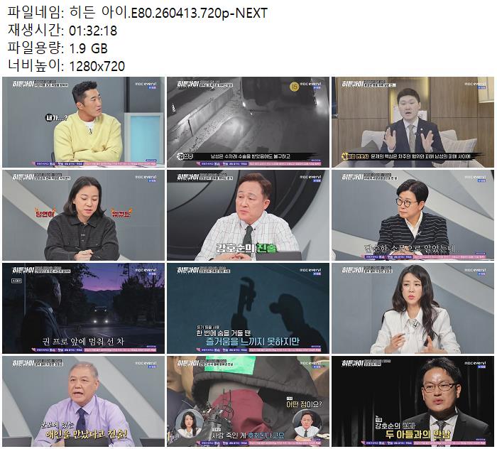 | 히든 아이.E80.260413.720p-NEXT.mp4 | 1.9 G | 01:32:00 | 1280x720 |