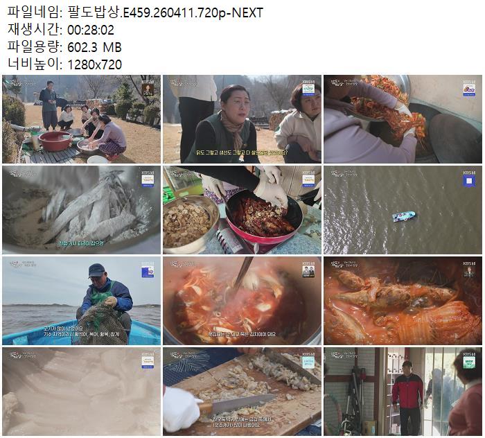 | 팔도밥상.E459.260411.720p-NEXT.mp4 | 602.3 M | 00:28:02 | 1280x720 |