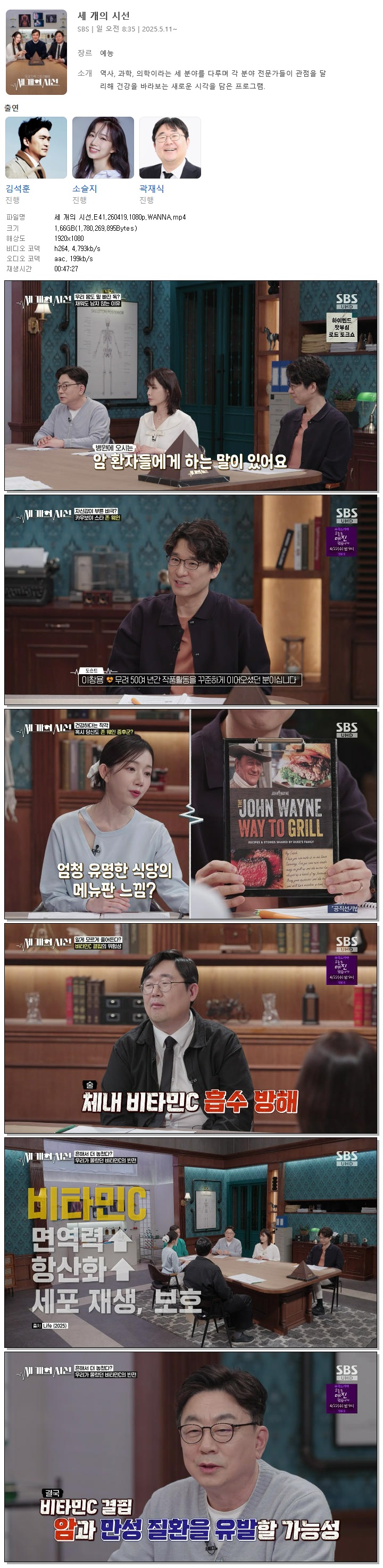 | [SBS] 세 개의 시선.E41.260419.1080p.WANNA[김석훈, 소슬지].mp4 | 1.7 G | 00:47:27 | 1920x1080 |