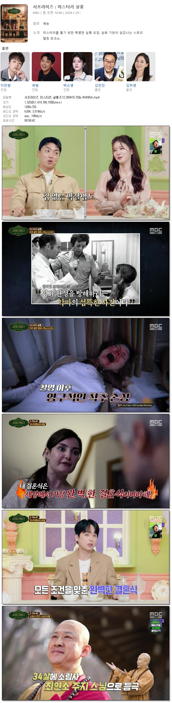 | [MBC] 서프라이즈 미스터리 살롱.E12.260419.720p.WANNA[이찬원, 곽범].mp4 | 1.3 G | 00:58:42 | 1280x720 |