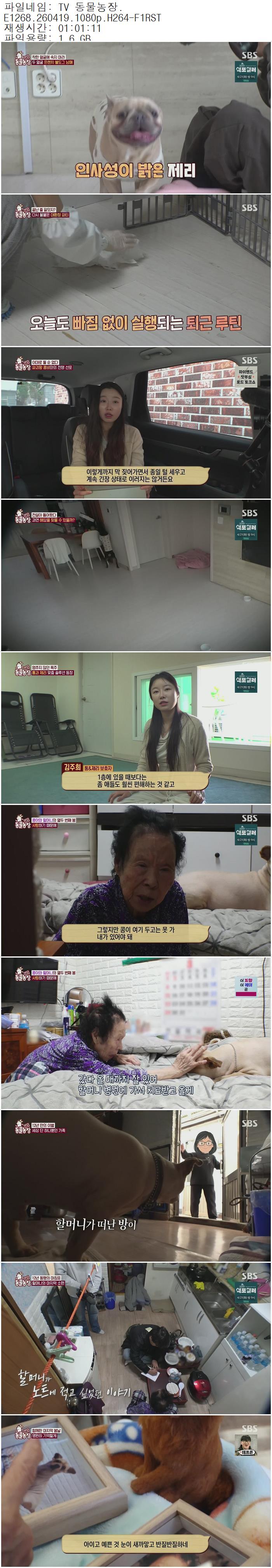 ▶파주 파괴왕 프렌치불독 톰&제리 엄마 없음 우리들만의 천국, 빈 집의 폭주 기관차 톰과 제리! 직장인이라면 응당 즐거워해야 할 퇴근 시간에 해방감보다는 중압감을 안고 집을 찾는다는 주희 씨. 집 입구에서부터 마스크를 쓰며 만반의 준비를 마치고 마주한 집안은 이미 초토화다. 넝마가 된 인형이며 조각난 휴지, 물어뜯어 놓은 뚫어뻥까지! 온 집안을 엉망진창으로 만들어놓은 주범은 바로, 오늘의 주견공 ‘톰’과 ‘제리’다. 낯선 사람도 반길 만큼 친화적이고 주희 씨 말도 잘 듣는 착한 녀석들이지만 주희 씨가 집에 없는 순간엔 파괴왕이 되어버린다. 덕분에 가전이며 가구, 소품까지 전부 파괴돼 강제 미니멀리즘(?)을 실천하며 살고 있단다. 톰과 제리를 막아보려 갖은 방법을 다 써봤지만 소용이 없다고 한다. 대체 녀석들에게는 무슨 문제가 있는 걸까? ▶동두천 치매 할머니와 콩이의 이별 동거 12년차, 할머니와 콩이의 아름다운 이별 50년에 가까운 세월 동안 혼자 사셨다는 87세 명자 할머니에게 특별한 가족이 있다. 그 주인공은 바로 빛나는 까만 눈을 자랑하는 ‘콩이’! 아무도 데려가지 않던 새끼 강아지를 거둬 인연을 맺은 것도 벌써 12년이 흘렀다. 각양각색의 영양제부터 간식까지 지극정성으로 콩이를 챙기는 할머니와 그런 할머니의 곁을 그림자처럼 지키는 견손주 콩이는 서로의 유일한 가족이다. 계란 한 알도 나눠먹으며 9평 남짓한 방 한 칸에서 온기를 나누던 할머니와 콩이의 소박한 일상에 이별이 찾아왔는데. 차마 발걸음이 떨어지지 않지만 서로의 안녕을 빌어줘야 하는 마지막 봄. 평생 함께 하겠다는 할머니의 약속은 지켜질 수 있을까? ▶용인 출산의 계절 <사막여우> 사막여우 ‘크림 & 버터’형제의 세상 적응기 따스한 봄바람이 불기 시작한 동물원에서 따뜻한 소식이 날아왔다. 구석구석 소독을 마친 후 들어간 집중관리실에는 태어난 지 42일 차인 사막여우 형제 ‘크림’와 ‘버터’가 있다. 작은 얼굴, 작은 몸집, 모든 것이 작고 소중하지만 특유의 큰 귀를 자랑하는 어엿한 사막여우의 모습이다. 부모의 보살핌을 받아야 했지만, 어미의 육아거부로 인공 포육으로 자라게 된 형제들. 사육사들의 정성과 사랑 덕분에 무럭무럭 자라 낯선 공간인 놀이방까지 입성했다! 새로운 공간에 첫 발을 들인 크림이와 버터 형제의 반응은?