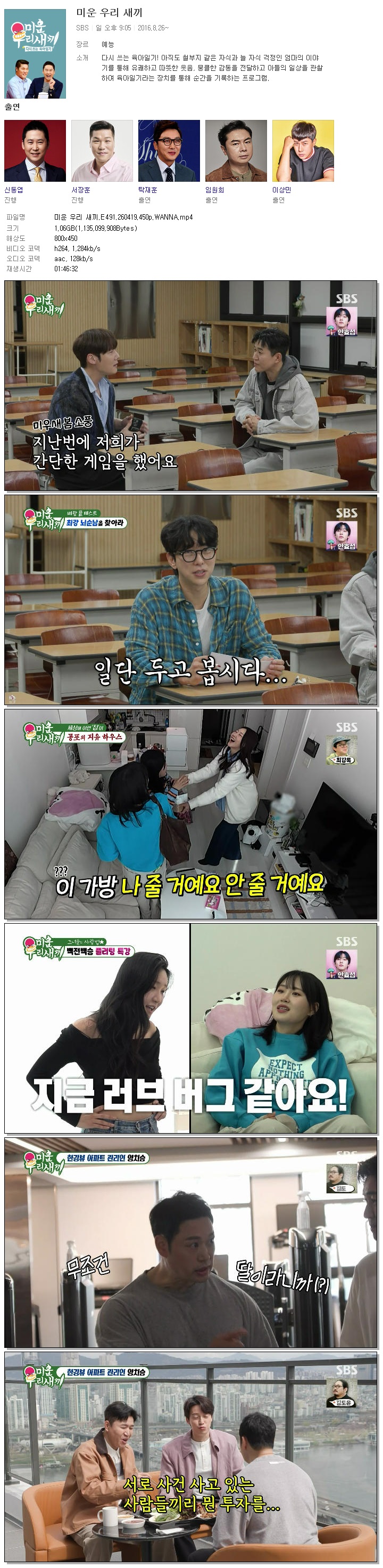| [SBS] 미운 우리 새끼.E491.260419.450p.WANNA[최진혁, 김종민].mp4 | 1.1 G | 01:46:32 | 800x450 |