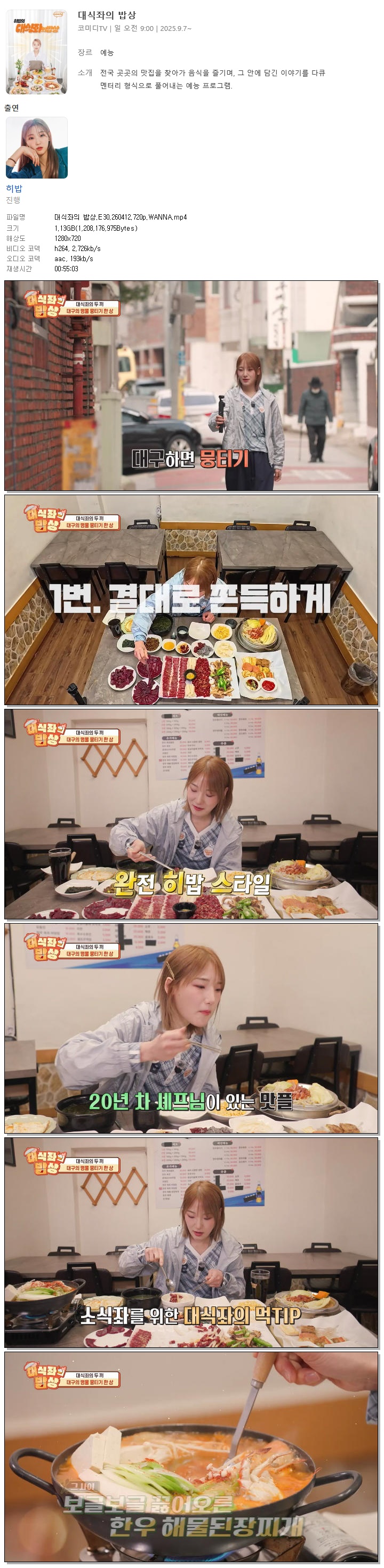 | [코미디TV] 대식좌의 밥상.E30.260412.720p.WANNA[히밥].mp4 | 1.1 G | 00:55:03 | 1280x720 |