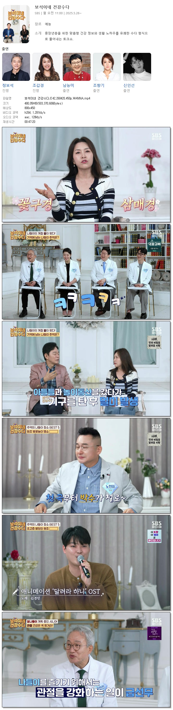 | [SBS] 보석이네 건강수다.E42.260420.450p.WANNA[정보석, 조갑경].mp4 | 480.1 M | 00:47:20 | 800x450 |