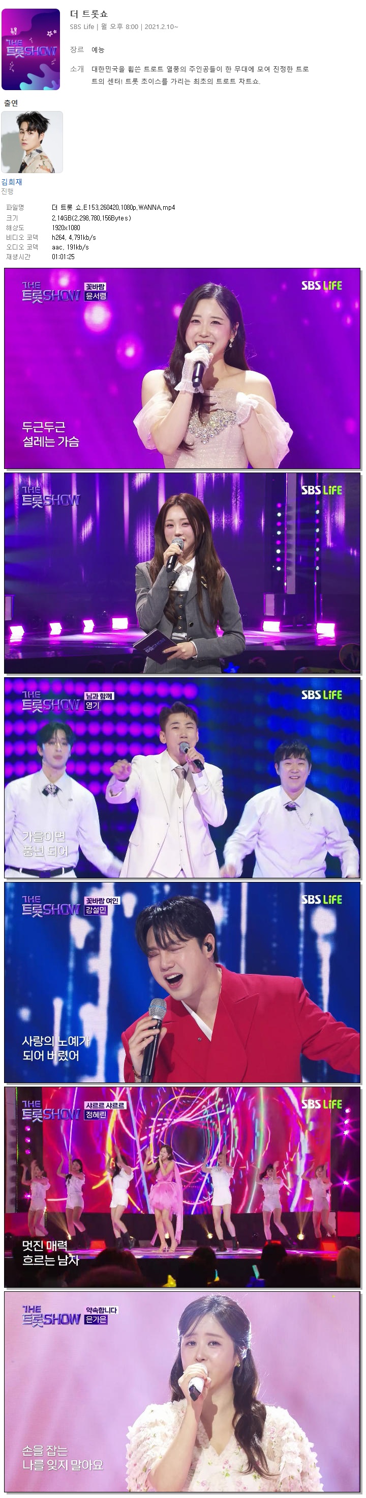 | [SBS LIFE] 더 트롯 쇼.E153.260420.1080p.WANNA[양지은, 안성훈].mp4 | 2.1 G | 01:01:25 | 1920x1080 |