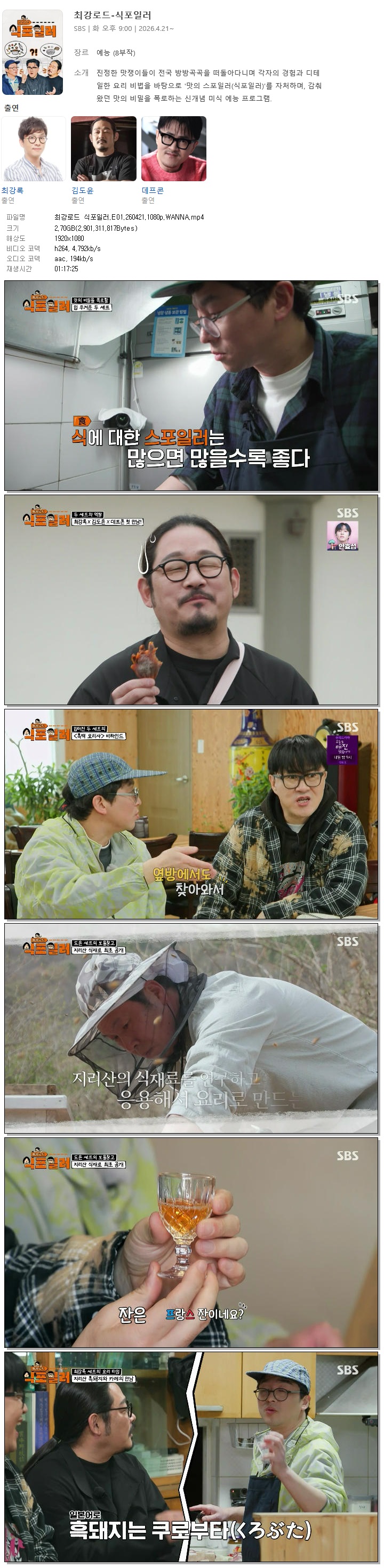 | [SBS] 최강로드 식포일러.E01.260421.1080p.WANNA[최강록, 데프콘].mp4 | 2.7 G | 01:17:25 | 1920x1080 |
