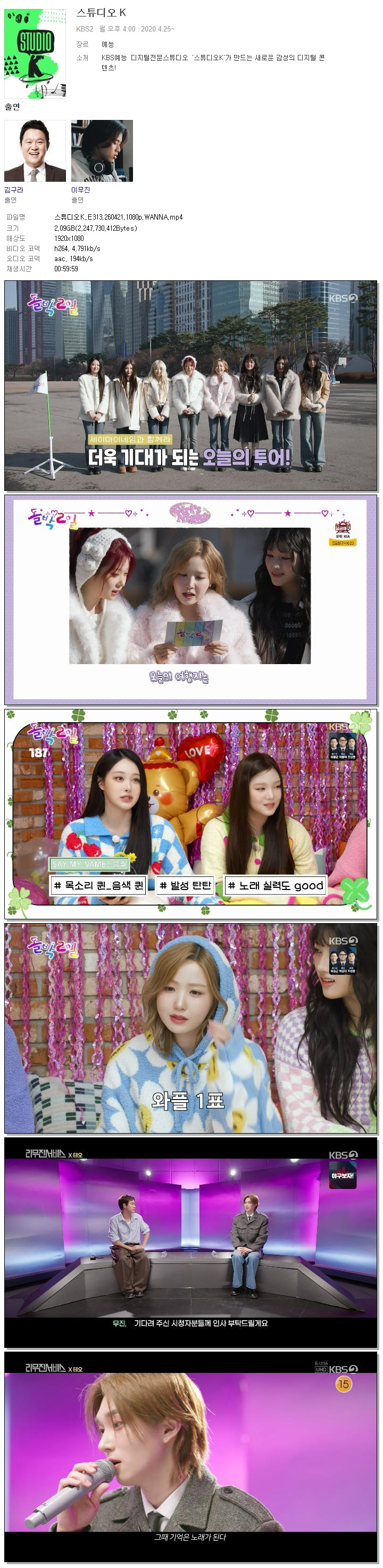 | [KBS2] 스튜디오K.E313.260421.1080p.WANNA.mp4 | 2.1 G | 00:59:59 | 1920x1080 |