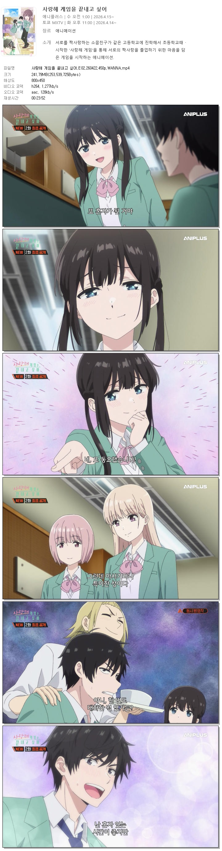 | 사랑해 게임을 끝내고 싶어.E02.260422.450p.WANNA.mp4 | 241.8 M | 00:23:52 | 800x450 |