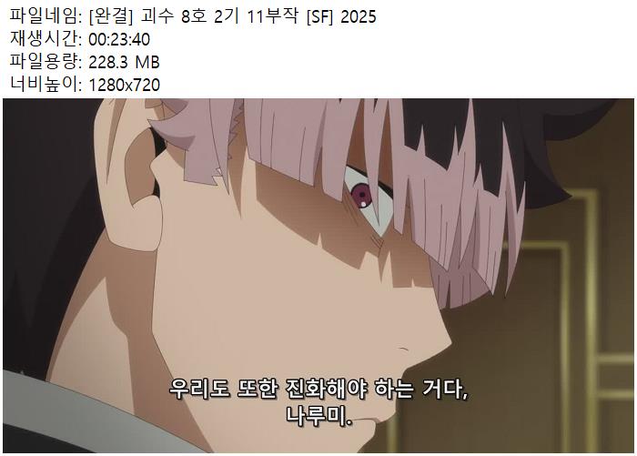 | 괴수 8호 2기 - 06.mp4 | 282.8 M | 00:23:40 | 1280x720 |