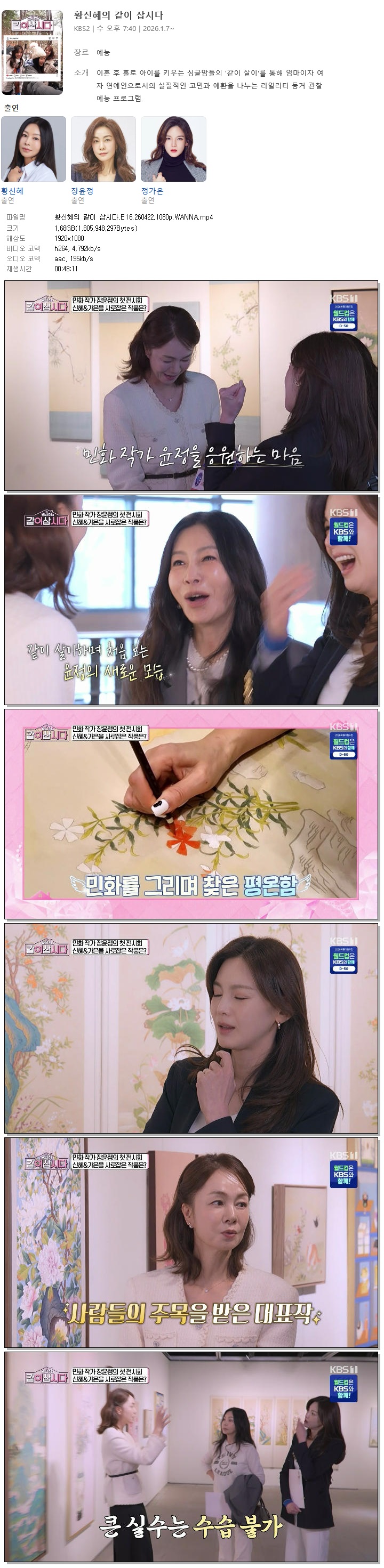 | [KBS1] 황신혜의 같이 삽시다.E16.260422.1080p.WANNA[황신혜, 정가은].mp4 | 1.7 G | 00:48:11 | 1920x1080 |