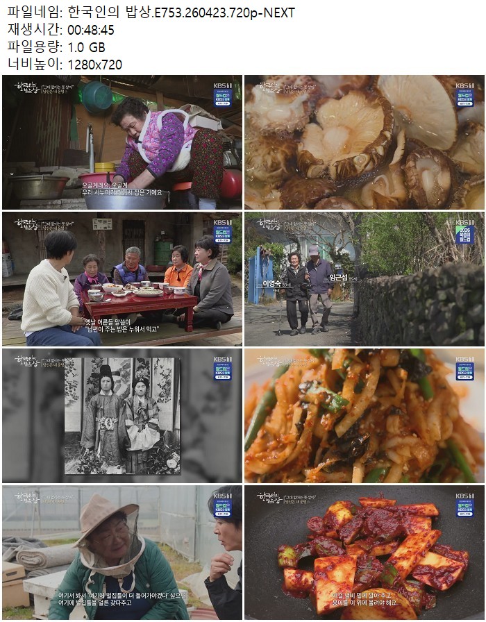 | 한국인의 밥상.E753.260423.720p-NEXT.mp4 | 1 G | 00:48:45 | 1280x720 |