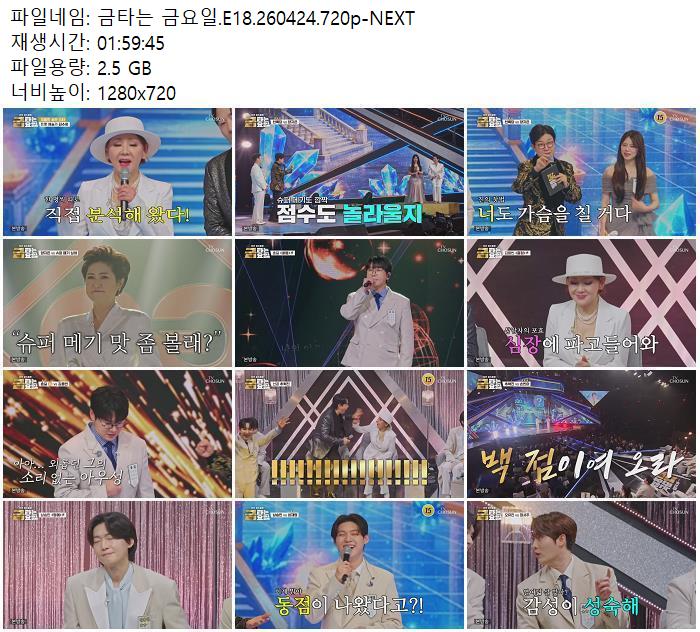 | 금타는 금요일.E18.260424.720p-NEXT.mp4 | 2.5 G | 01:59:00 | 1280x720 |