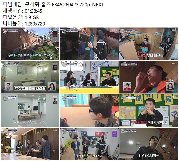 | 구해줘 홈즈.E346.260423.720p-NEXT.mp4 | 1.9 G | 01:28:00 | 1280x720 |