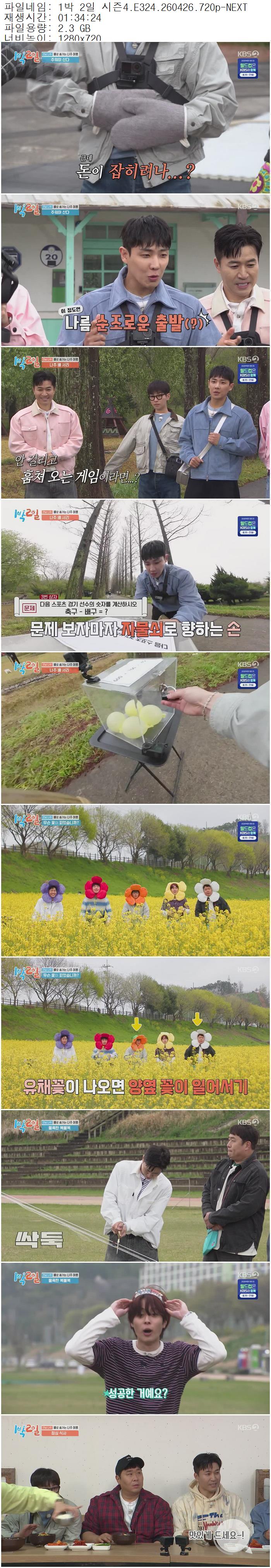 | 1박 2일 시즌4.E324.260426.720p-NEXT.mp4 | 2.3 G | 01:34:24 | 1280x720 |