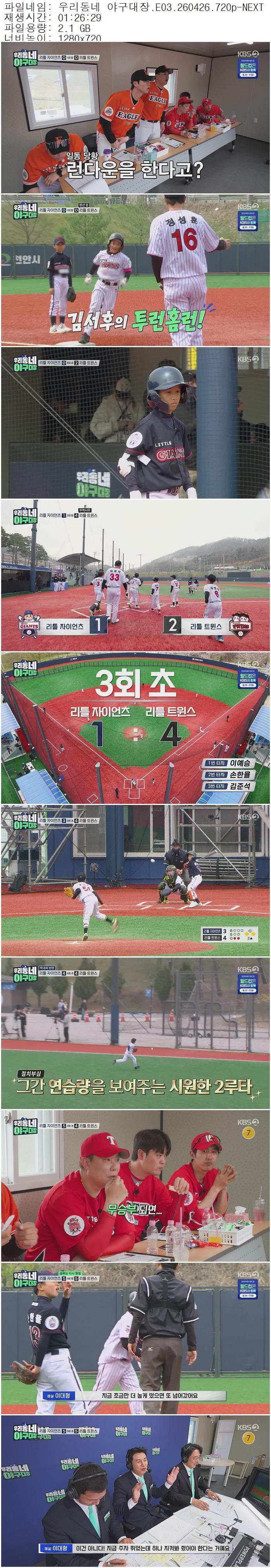 | 우리동네 야구대장.E03.260426.720p-NEXT.mp4 | 2.1 G | 01:26:29 | 1280x720 |