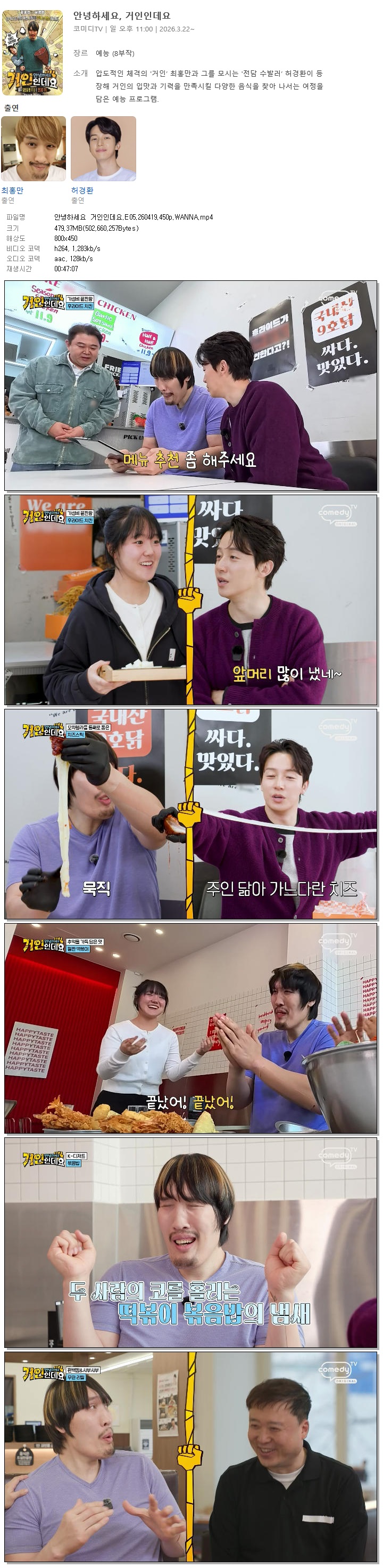 | [코미디TV] 안녕하세요 거인인데요.E05.260419.450p.WANNA[최홍만, 허경환].mp4 | 479.4 M | 00:47:07 | 800x450 |