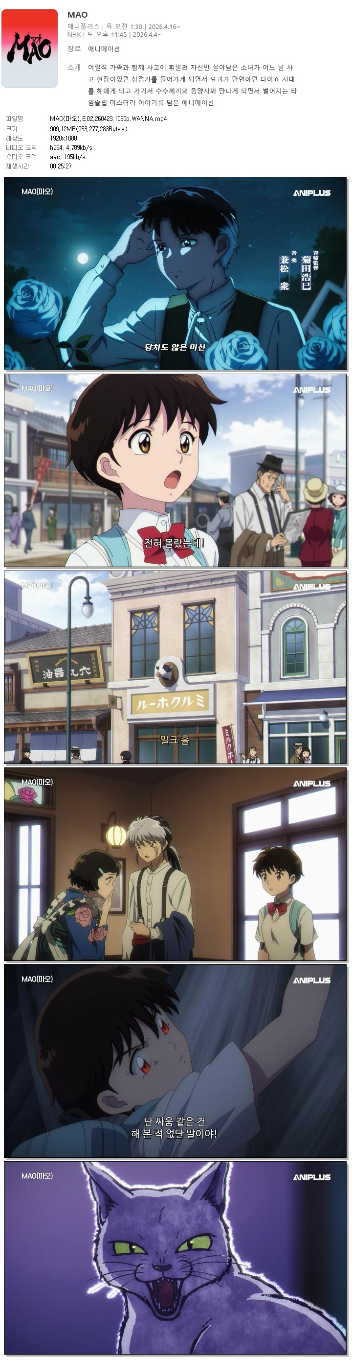 | MAO(마오).E02.260423.1080p.WANNA.mp4 | 909.1 M | 00:25:27 | 1920x1080 |