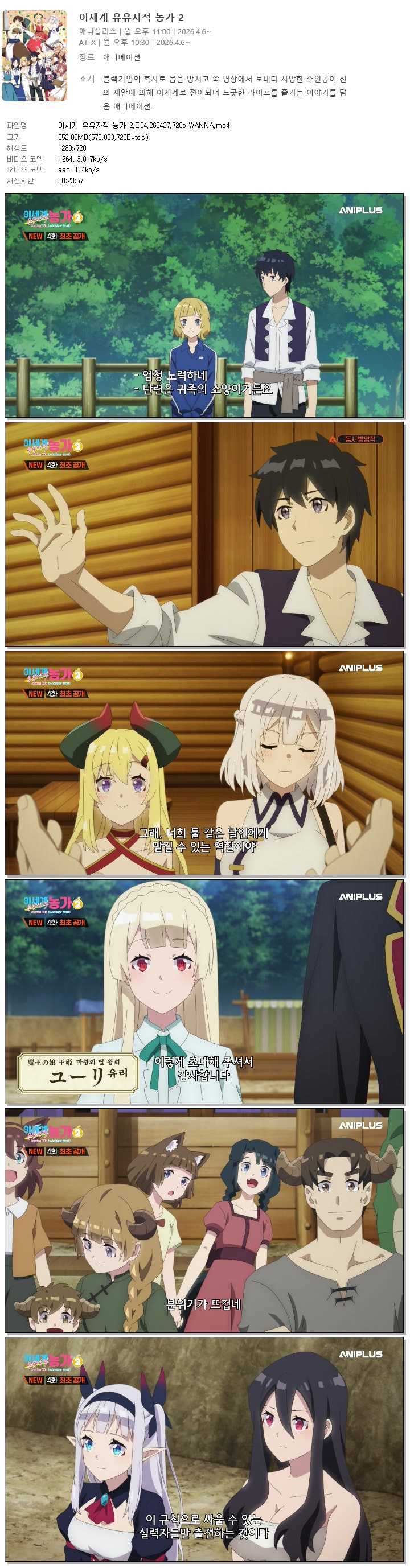 | 이세계 유유자적 농가 2.E04.260427.720p.WANNA.mp4 | 552 M | 00:23:57 | 1280x720 |