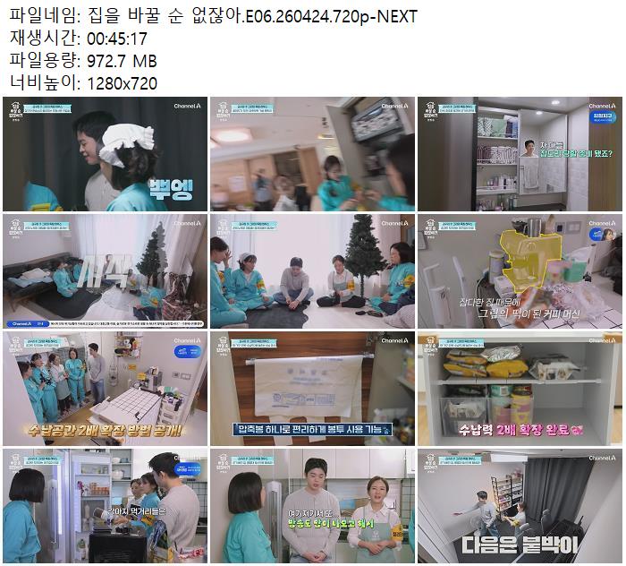 | 집을 바꿀 순 없잖아.E06.260424.720p-NEXT.mp4 | 972.7 M | 00:45:17 | 1280x720 |
