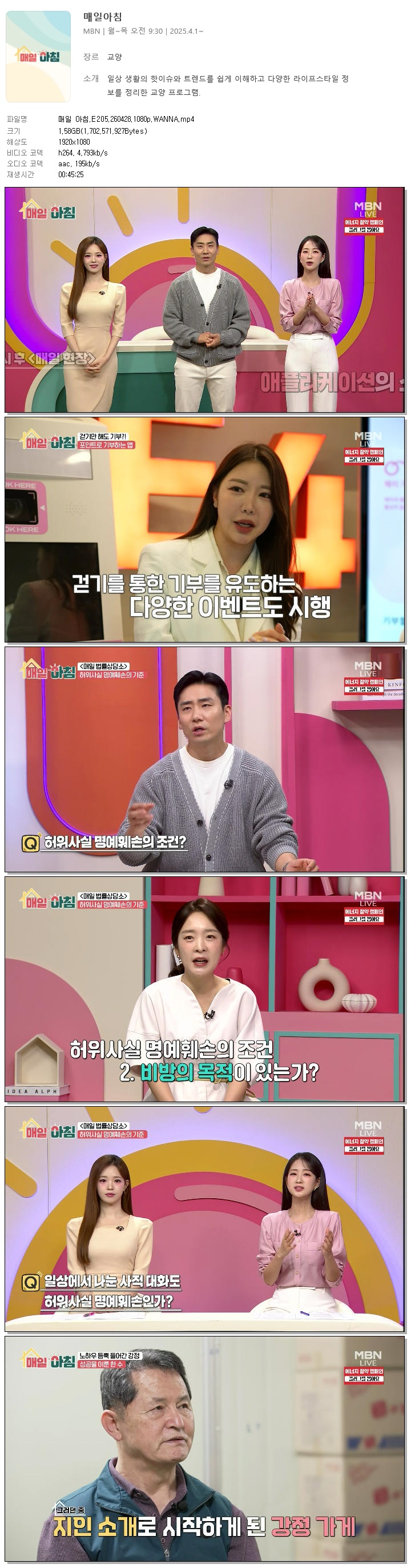 | [MBN] 매일 아침.E205.260428.1080p.WANNA[한혜원, 이정수].mp4 | 1.6 G | 00:45:25 | 1920x1080 |