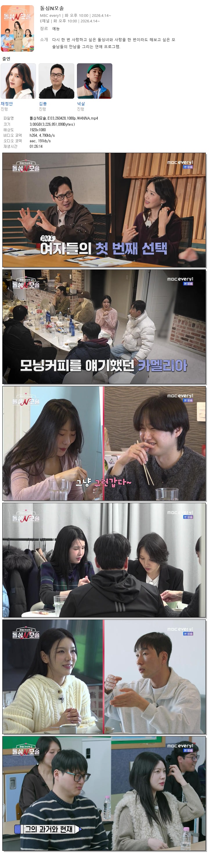 | [MBC Every1] 돌싱N모솔.E03.260428.1080p.WANNA[채정안, 김풍].mp4 | 3 G | 01:26:14 | 1920x1080 |