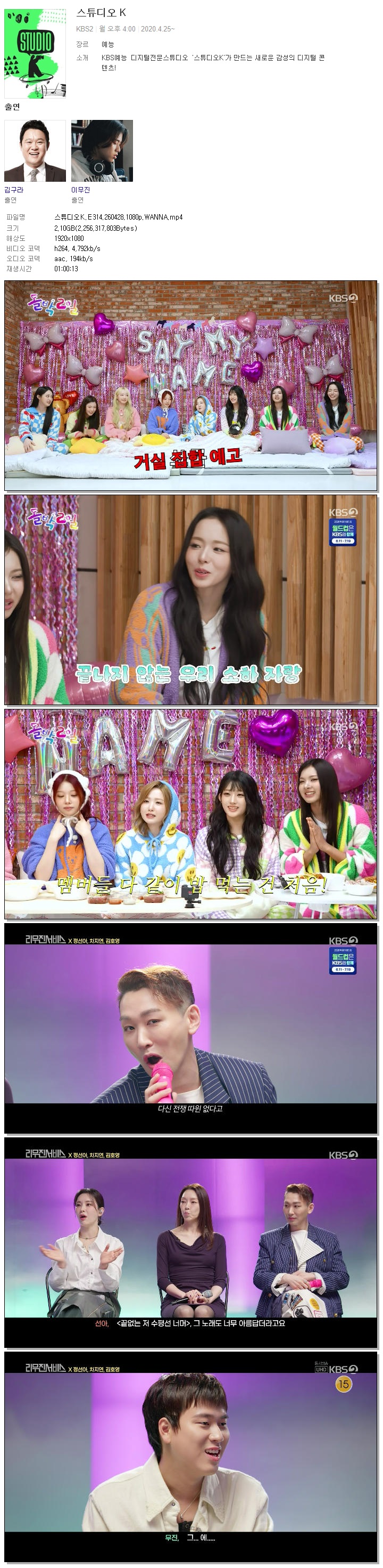 | [KBS2] 스튜디오K.E314.260428.1080p.WANNA.mp4 | 2.1 G | 01:00:13 | 1920x1080 |