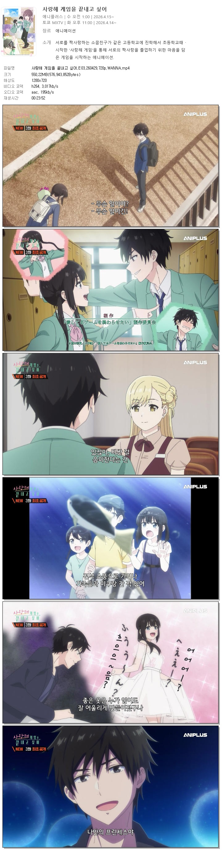 | 사랑해 게임을 끝내고 싶어.E03.260429.720p.WANNA.mp4 | 550.2 M | 00:23:52 | 1280x720 |