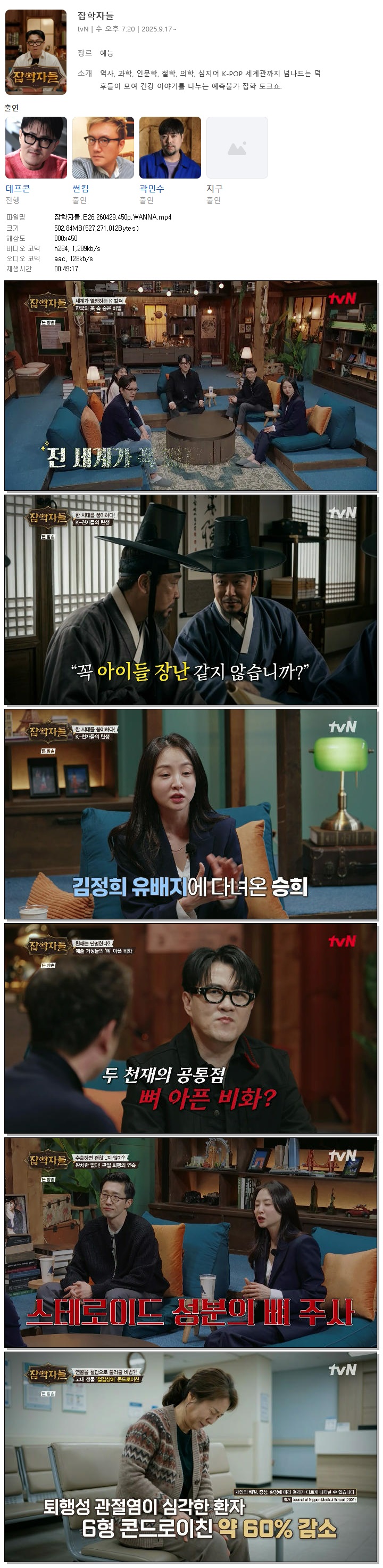 | [TVN] 잡학자들.E26.260429.450p.WANNA[데프콘, 썬킴].mp4 | 502.8 M | 00:49:17 | 800x450 |