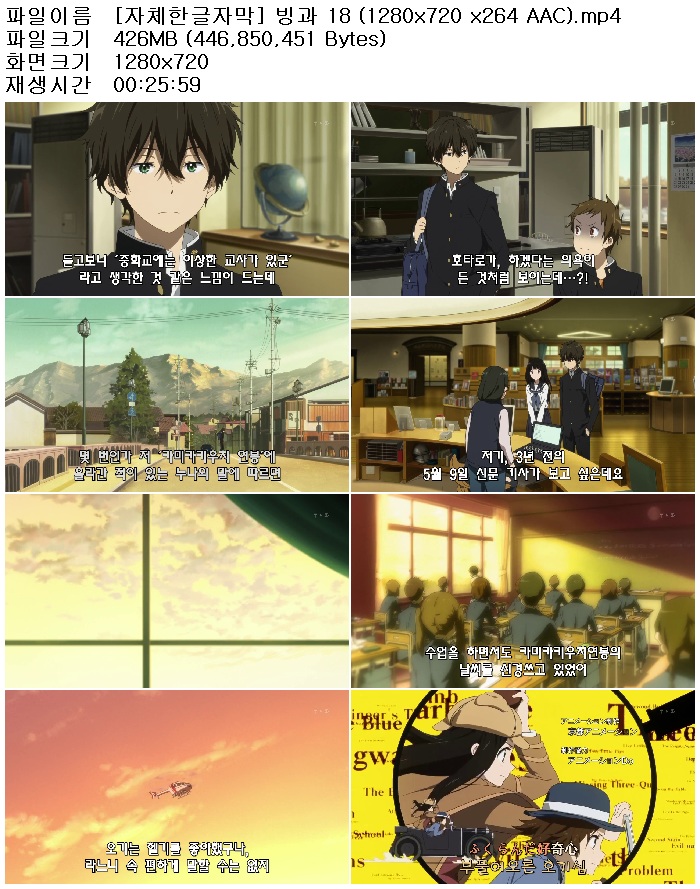 | [자체한글자막] 빙과 18 (1280x720 x264 AAC).mp4 | 426.1 M | 00:25:59 | 1280x720 |