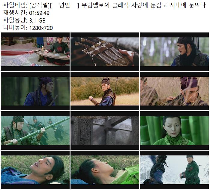 | [공식릴][---연인---] 무협멜로의 클래식 사랑에 눈감고 시대에 눈뜨다.mp4 | 3.1 G | 01:59:49 | 1280x720 |