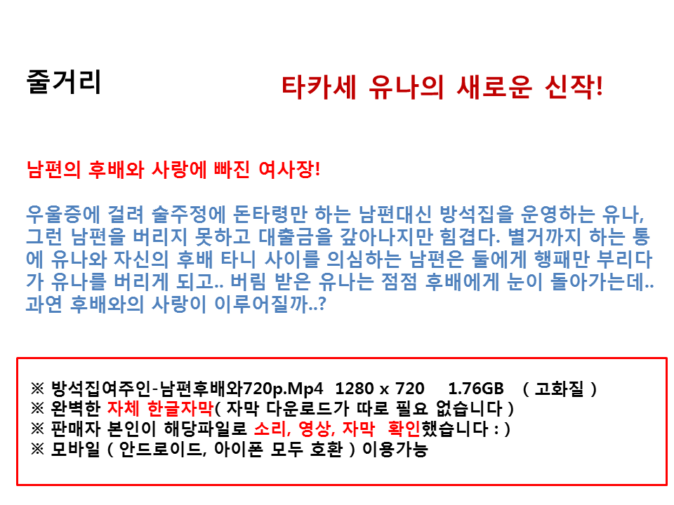 | 방석집여주인-남편후배와_720p.mp4 | 1.8 G | 01:01:22 | 1280x720 |