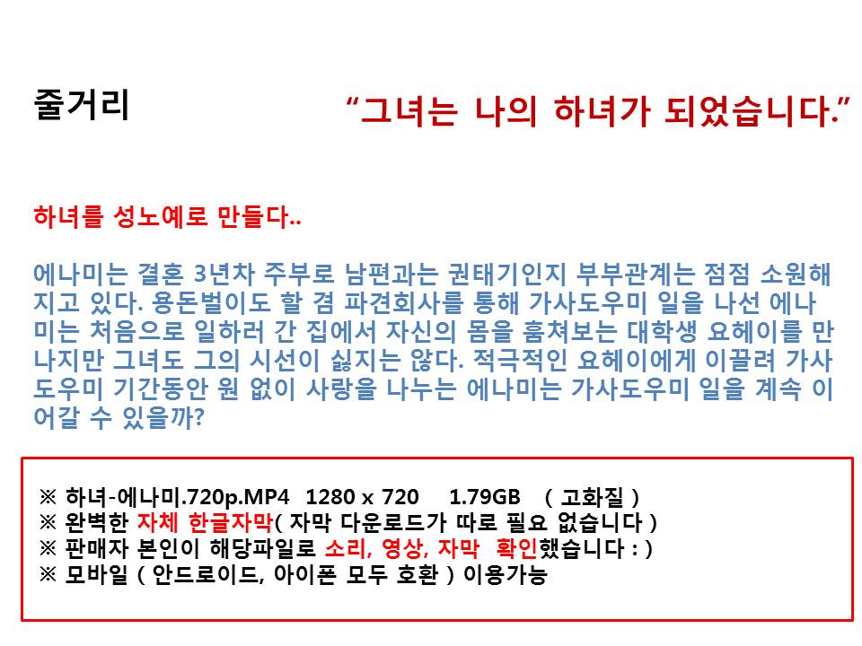 | 하녀-에나미_720p.mp4 | 1.8 G | 01:01:48 | 1280x720 |