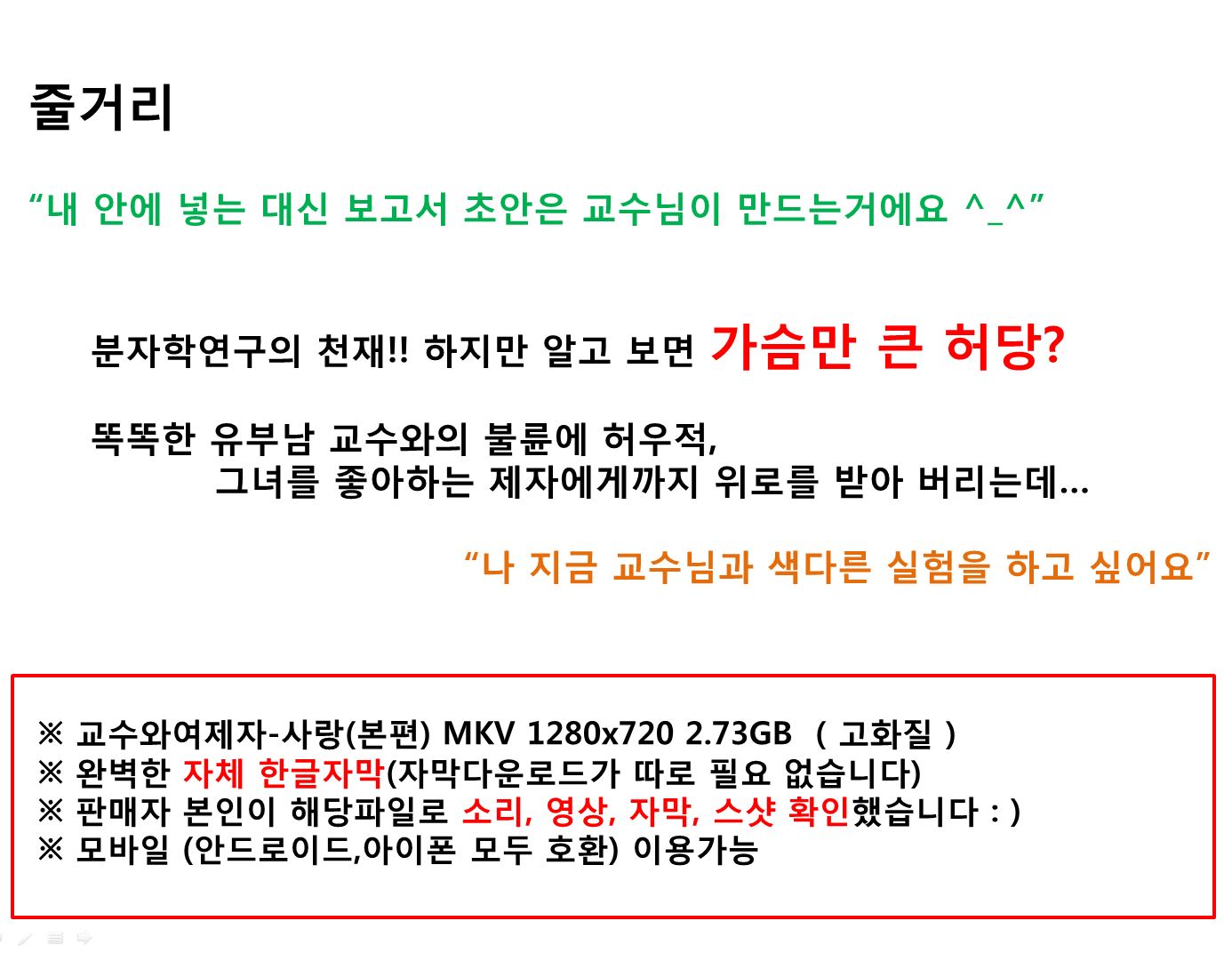 | 교수와여제자-사랑(본편).mkv | 2.7 G | 01:34:31 | 1280x720 |