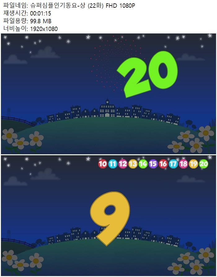 | 슈퍼심플인기동요-상 (22화) FHD 1080P.mp4 | 99.8 M | 00:01:15 | 1920x1080 |