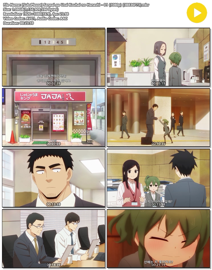 | [SubsPlease] Senpai ga Uzai Kouhai no Hanashi - 01 (1080p) [3B836F73].mkv | 1.1 G | 00:23:59 | 1920x1080 |