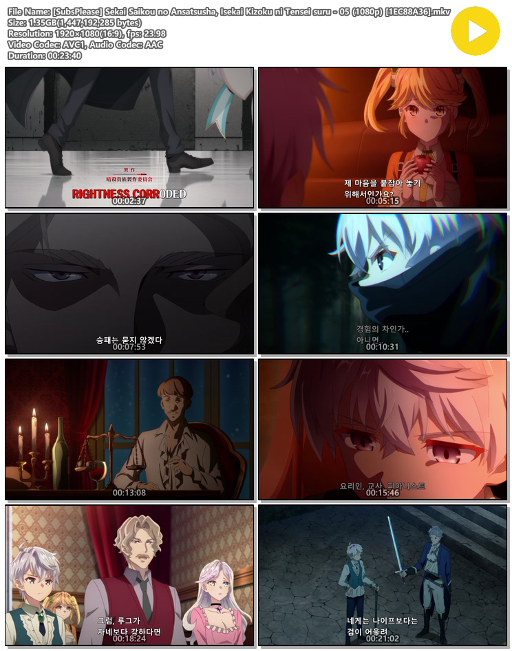 [SubsPlease] Sekai Saikou no Ansatsusha, Isekai Kizoku ni Tensei suru - 05 (1080p) [1EC88A36].mkv 1.3 G 00:23:40 1920x1080