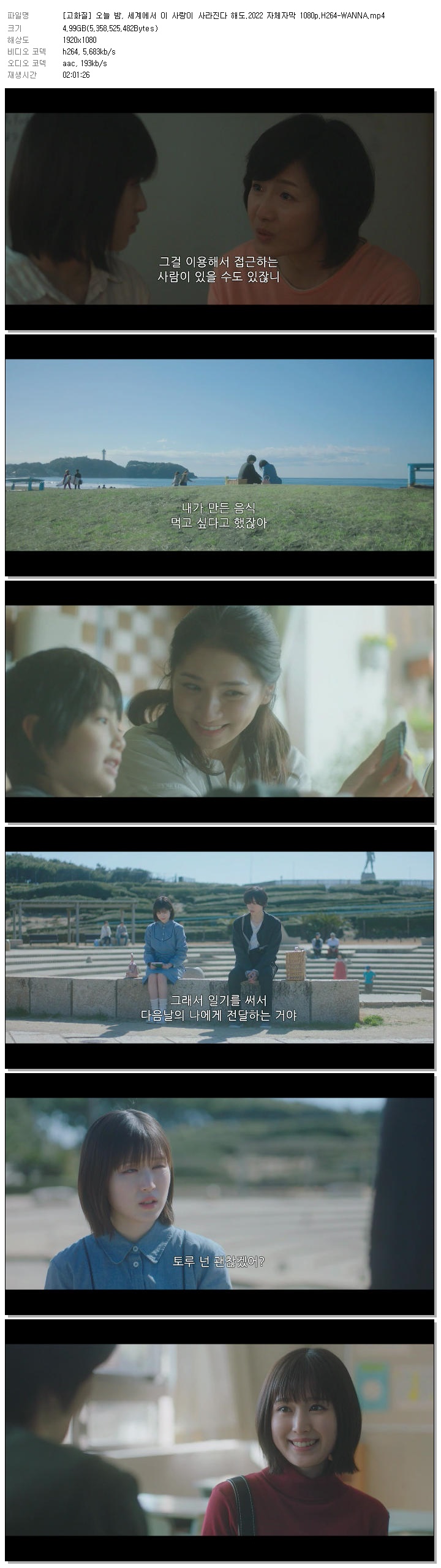 | [고화질] 오늘 밤, 세계에서 이 사랑이 사라진다 해도.2022 자체자막 1080p.H264-WANNA.mp4 | 5 G | 02:01:26 | 1920x1080 |