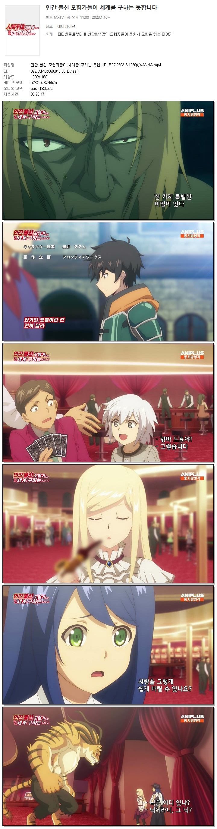 | 인간 불신 모험가들이 세계를 구하는 듯합니다.E07.230216.1080p.WANNA.mp4 | 829.6 M | 00:23:47 | 1920x1080 |