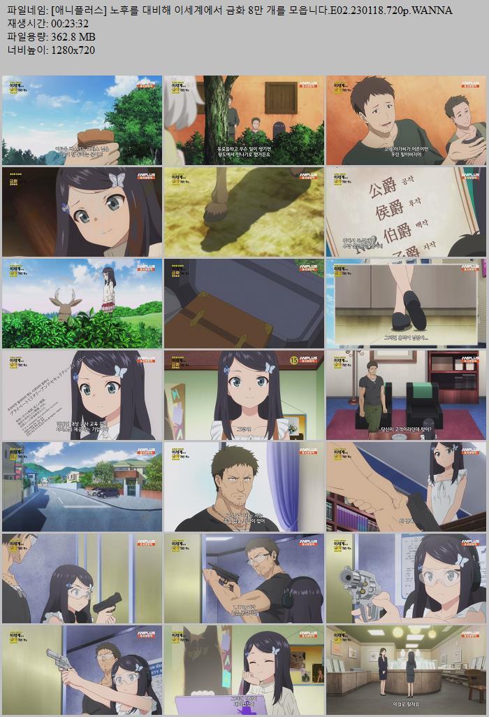 | [애니플러스] 노후를 대비해 이세계에서 금화 8만 개를 모읍니다.E02.230118.720p.WANNA.mp4 | 362.8 M | - | 1280x720 |