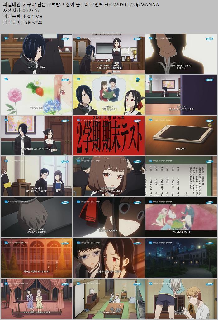 | 카구야 님은 고백받고 싶어 울트라 로맨틱.E04.220501.720p.WANNA.mp4 | 400.4 M | - | 1280x720 |