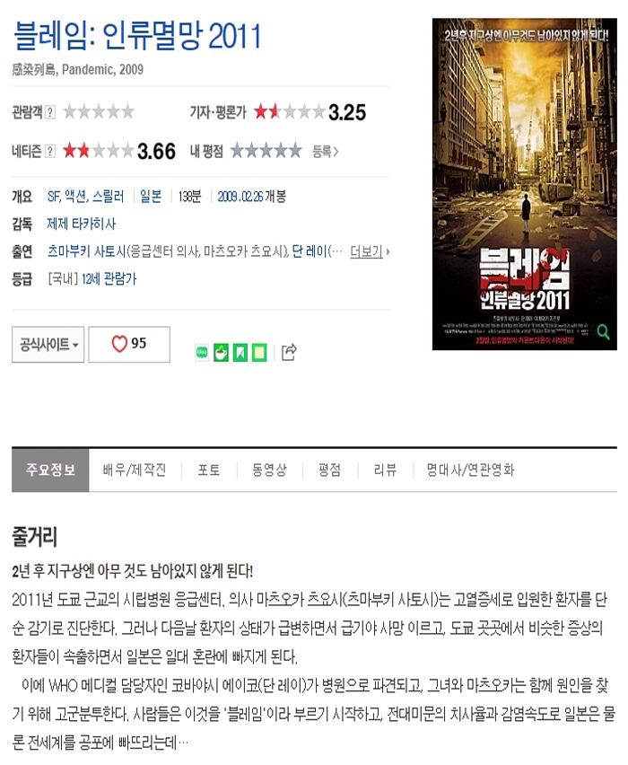 | (인류멸망 2011 블레임) 2009 한글자막_1.avi | 3.5 G | - | 1280x688 |